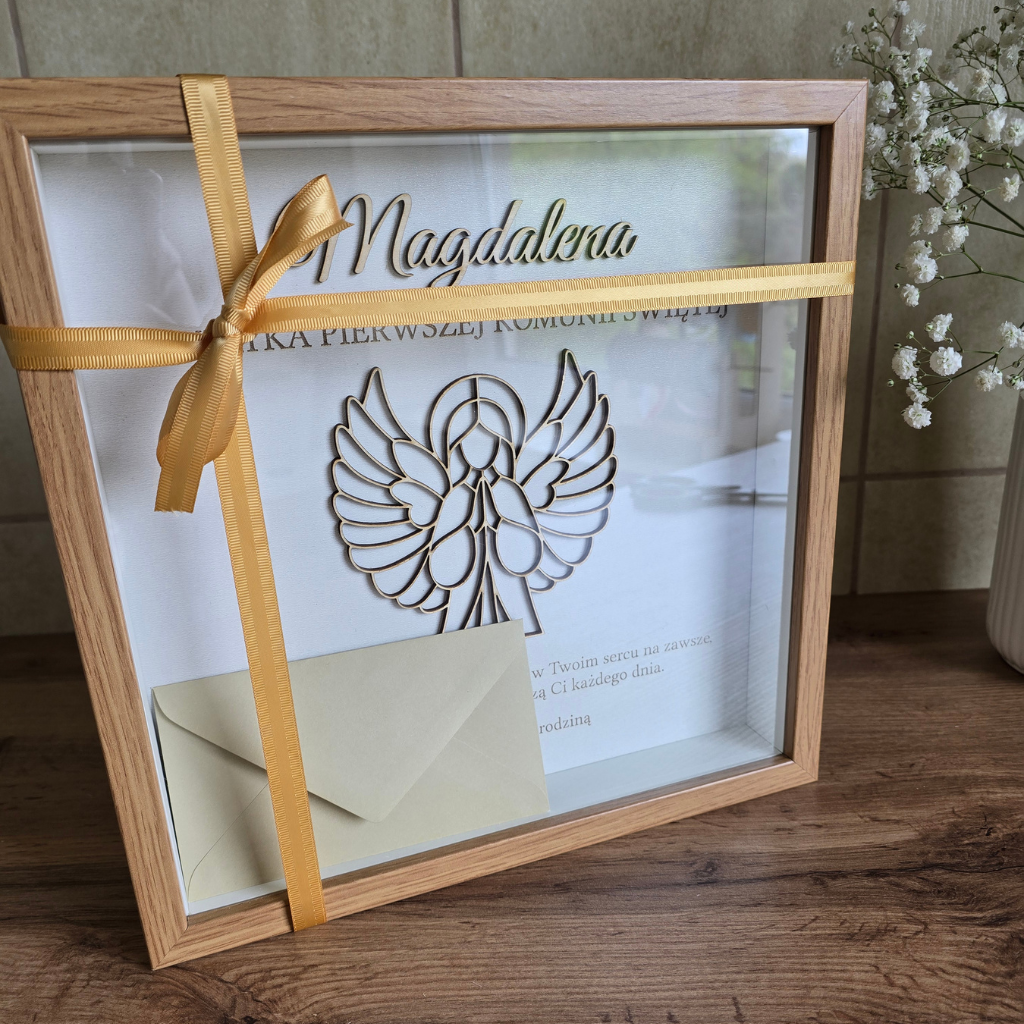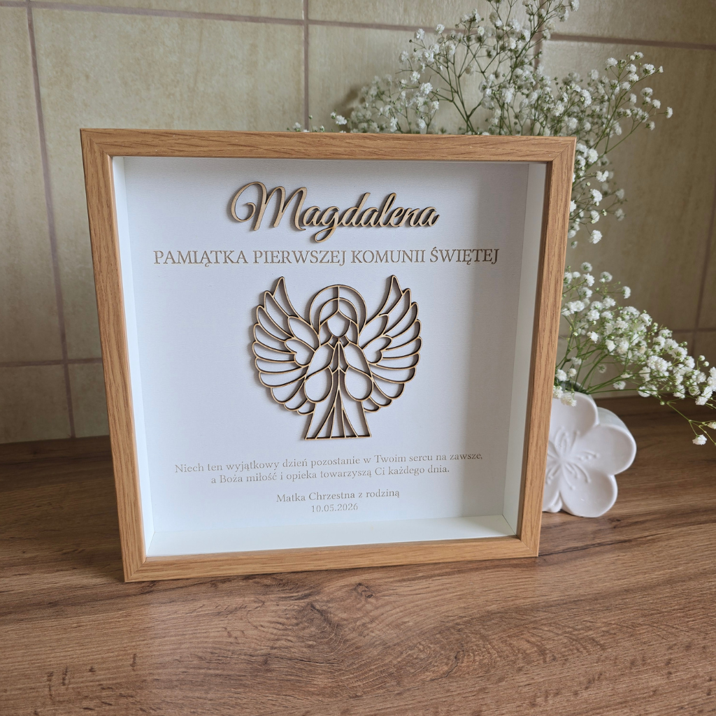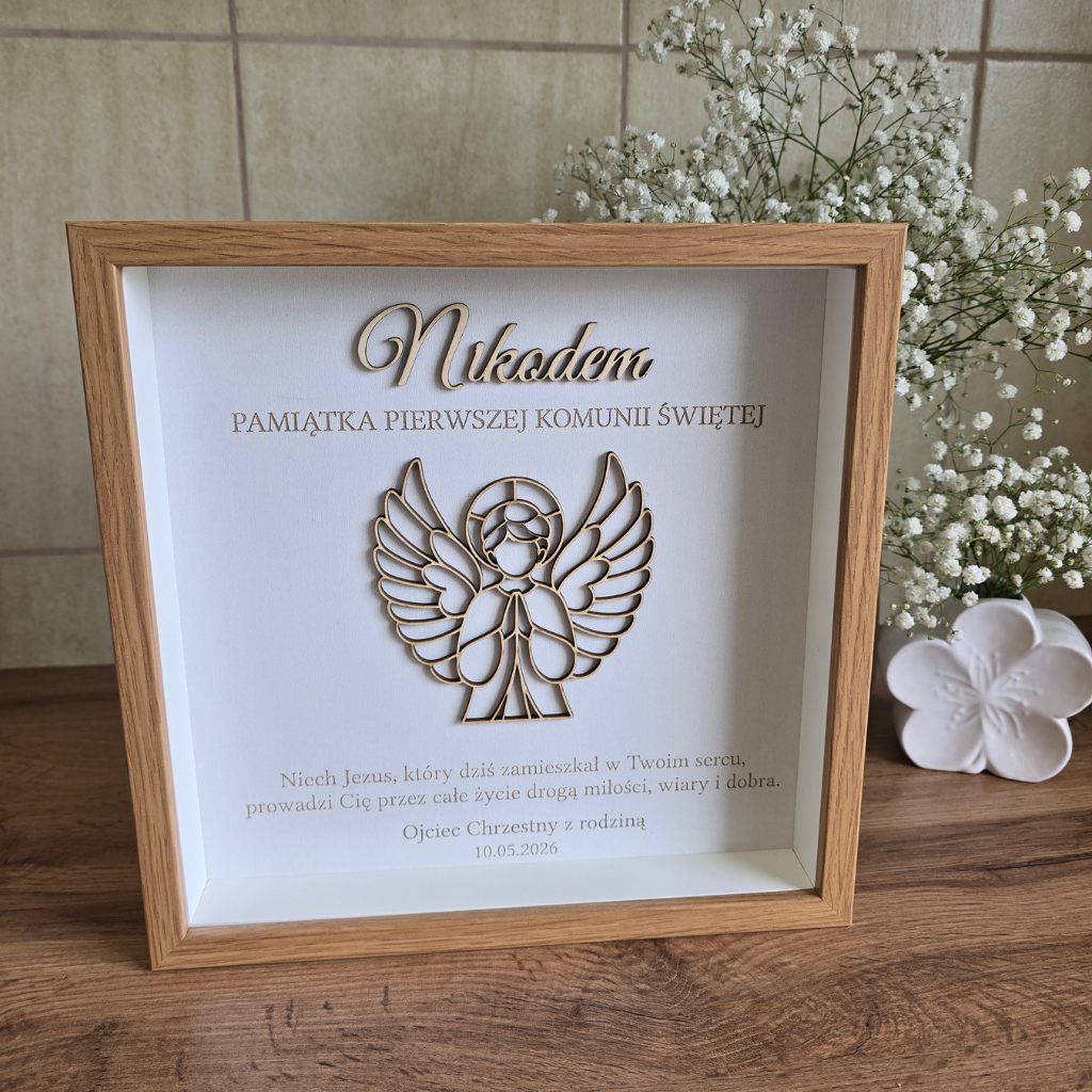 Elegancka rama z Aniołkiem – wyjątkowe połączenie drewnianej sklejki i klasycznej oprawy. Idealny prezent od Chrzestnych, Dziadków lub Rodziców.