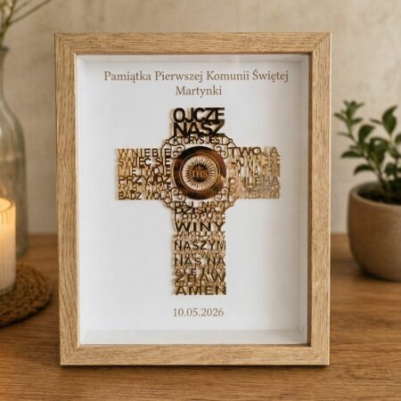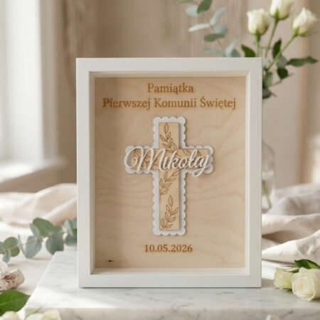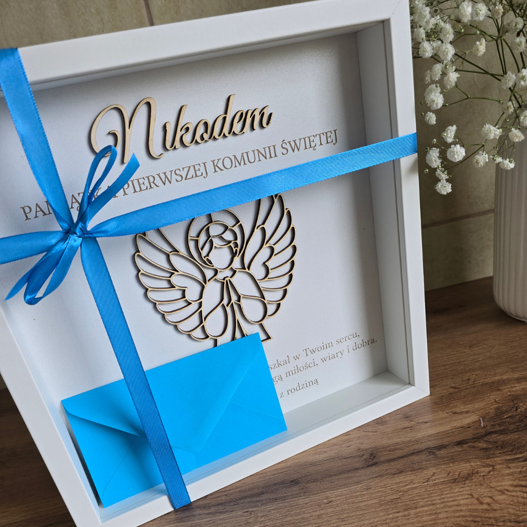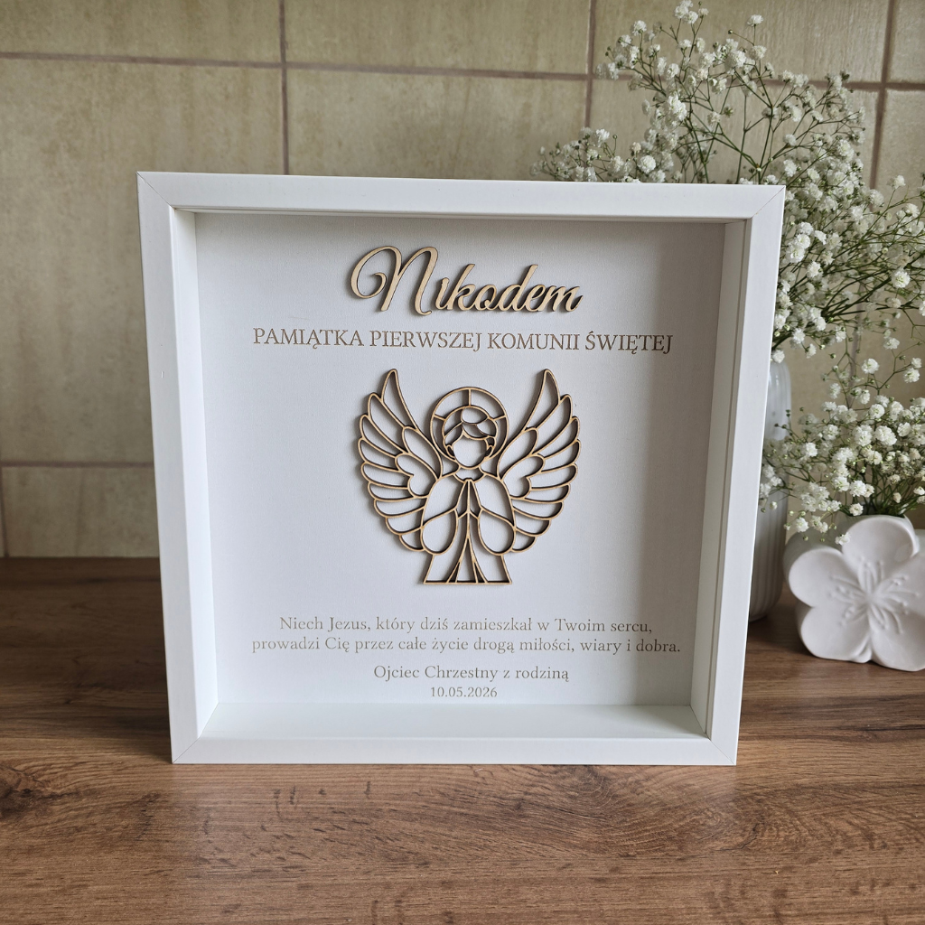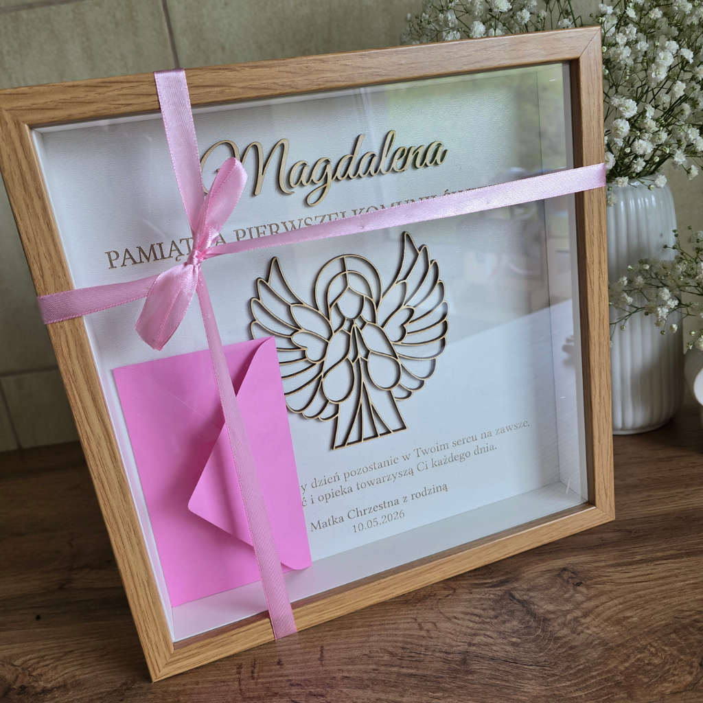 Elegancka rama z Aniołkiem – wyjątkowe połączenie drewnianej sklejki i klasycznej oprawy. Idealny prezent od Chrzestnych, Dziadków lub Rodziców.