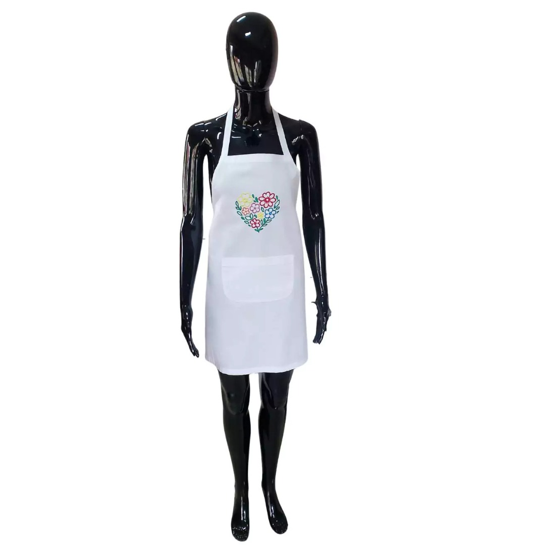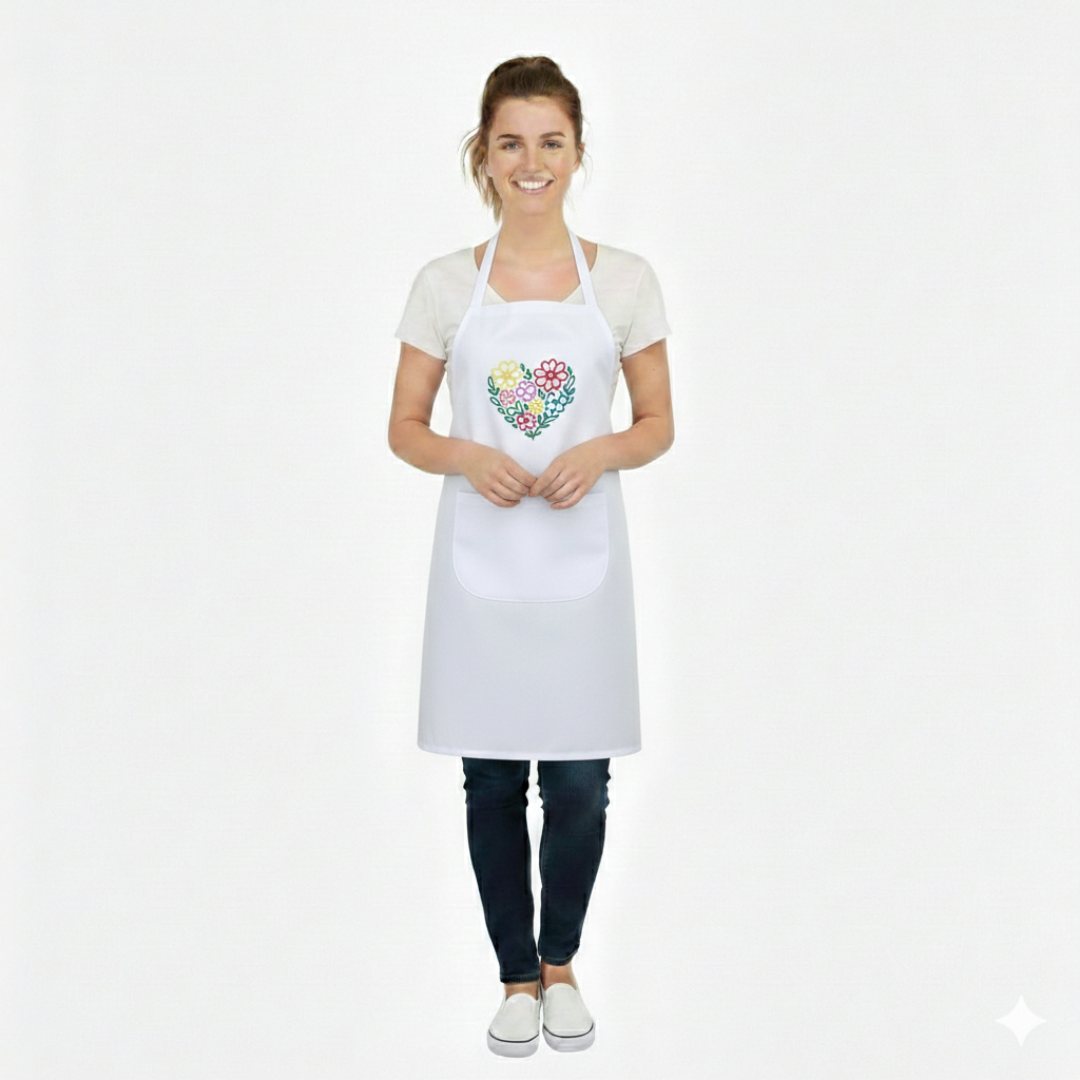 Profesjonalny fartuszek w eleganckim, białym kolorze, wykonany z trwałej mieszanki poliestru i bawełny. Wyróżnia się dekoracyjnym haftem serce w wielobarwnych kolorach , umieszczonym centralnie na wysokości klatki piersiowej. Haft ma wymiary 10 cm długości i 11,5 cm szerokości, co dodaje całości wyjątkowego, stylowego charakteru.