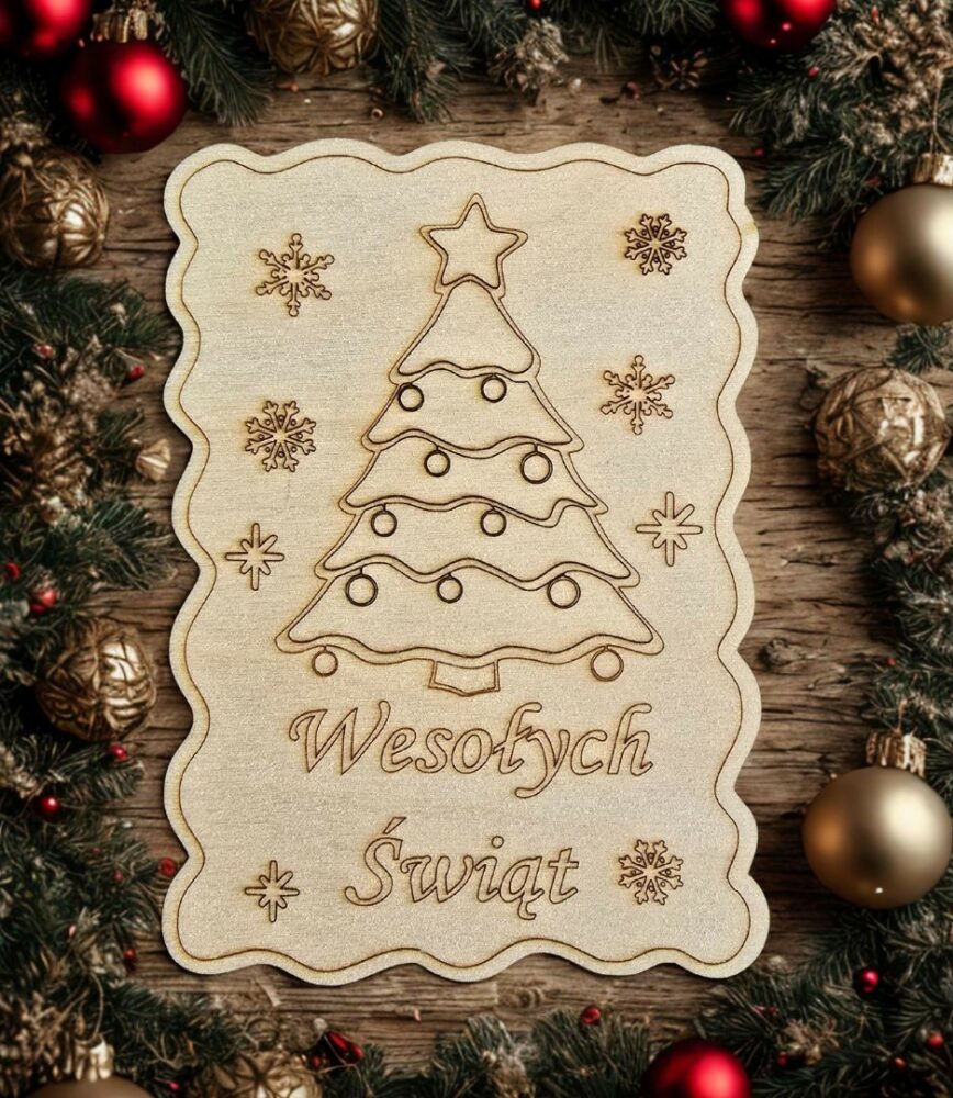 Elegancka i trwała kartka świąteczna wykonana ze sklejki, ozdobiona precyzyjnym grawerem. To idealny, wyjątkowy dodatek do prezentu lub oryginalny sposób na złożenie świątecznych życzeń. Naturalny materiał oraz świąteczny motyw nadają jej niepowtarzalny, ciepły charakter.