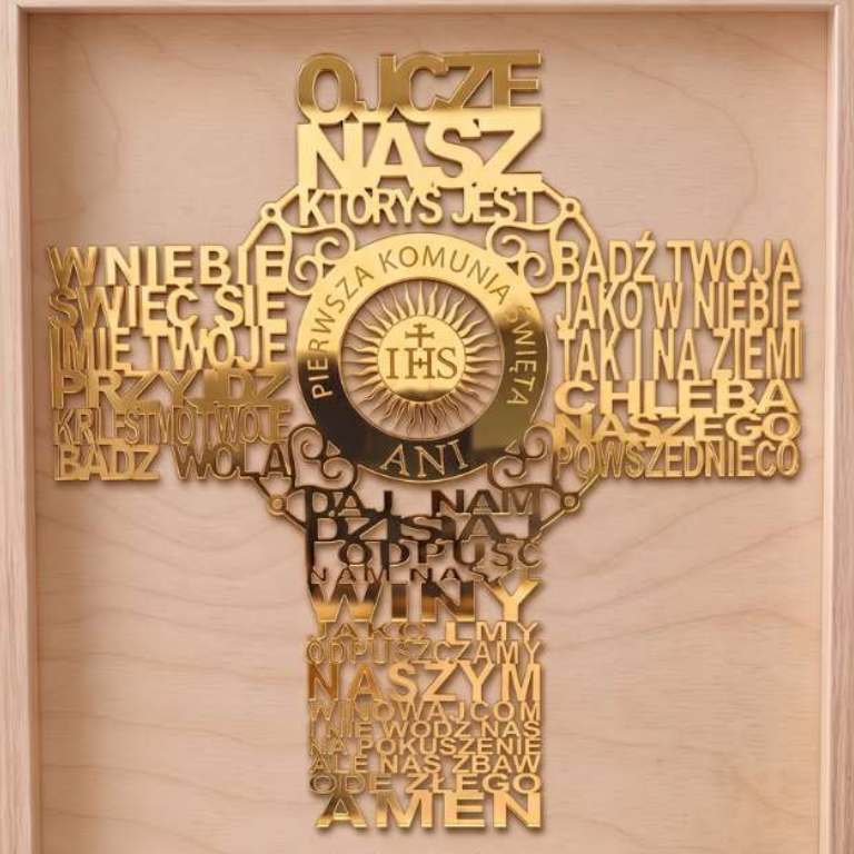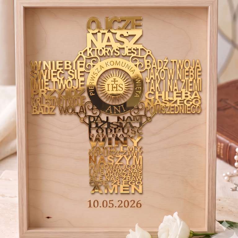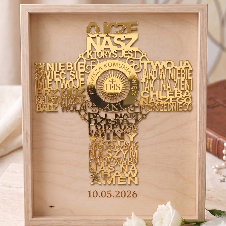 Elegancka rama z ażurową modlitwą „Ojcze Nasz”. Połączenie naturalnego drewna i lśniącego złotego lustra tworzy wyjątkowy efekt, idealny jako pamiątka od Chrzestnych, Dziadków lub Rodziców.