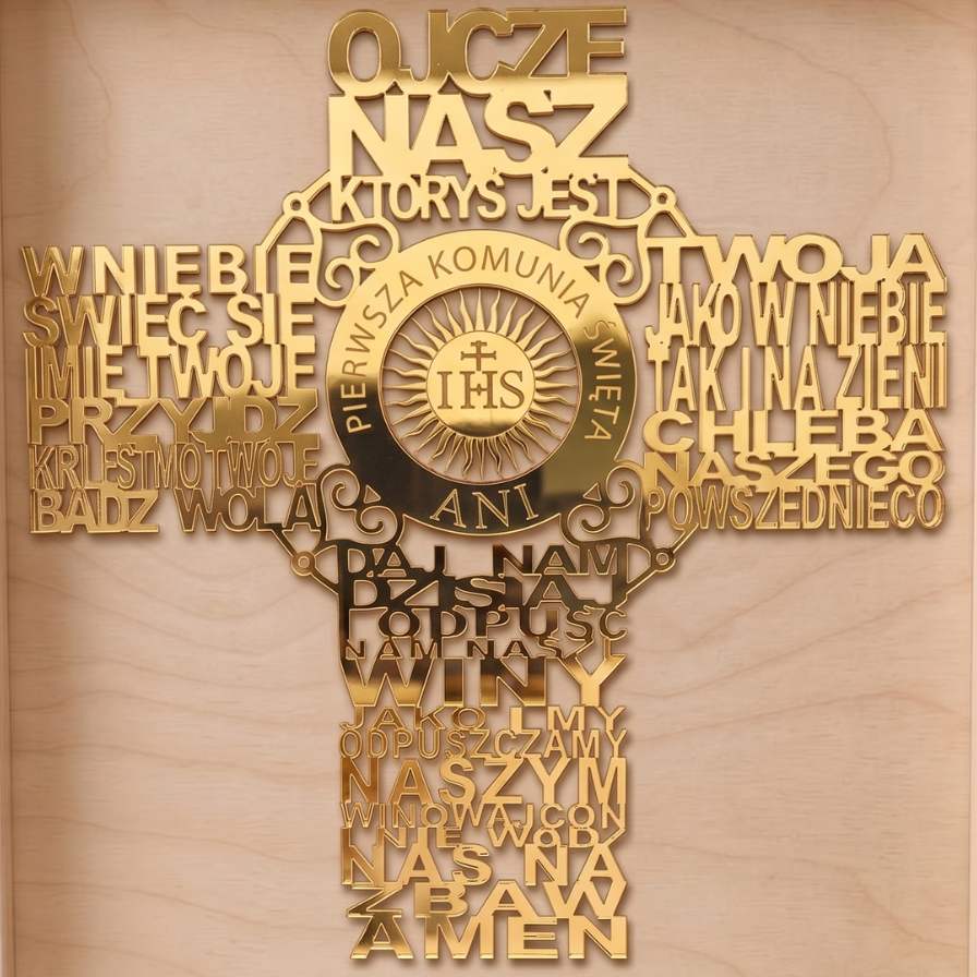 Materiał Premium: Krzyż z modlitwą wykonany z efektownego złotego lustra (pleksi).