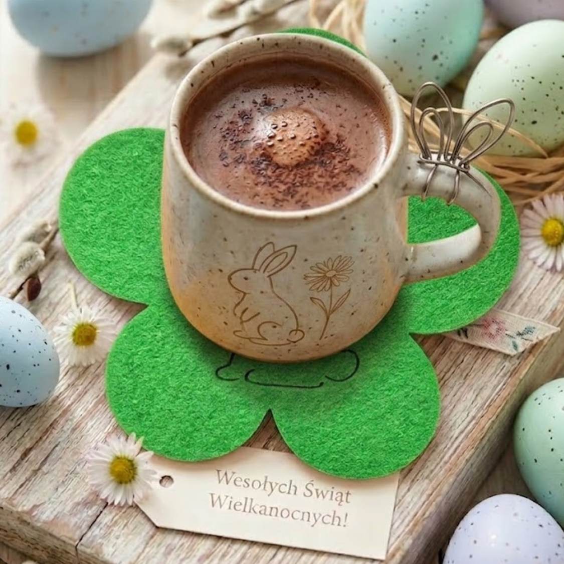 Dzięki kompaktowym wymiarom 11,5 × 11,5 cm pasuje do większości kubków i filiżanek. Doskonale nadaje się zarówno do codziennego użytku, jak i do wielkanocnych aranżacji stołu. Może być również miłym, drobnym upominkiem świątecznym. 🐣🌼☕