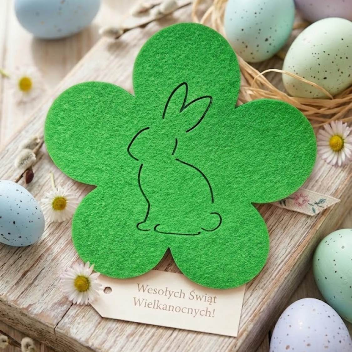 Podkładka pod kubek wykonana z wysokiej jakości filcu w wiosennym, zielonym kolorze. Idealnie sprawdzi się jako dekoracja stołu na Wielkanoc, wprowadzając ciepły i świąteczny akcent do wnętrza. Chroni powierzchnię stołu przed ciepłem oraz wilgocią z kubków i szklanek.