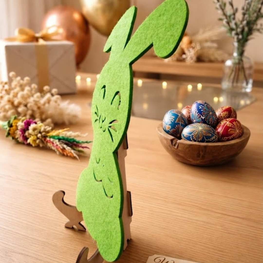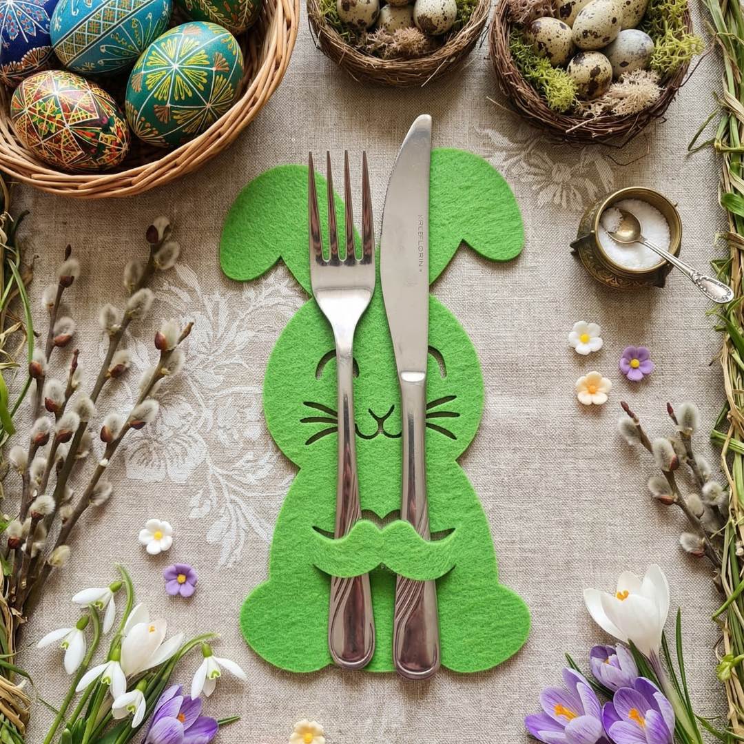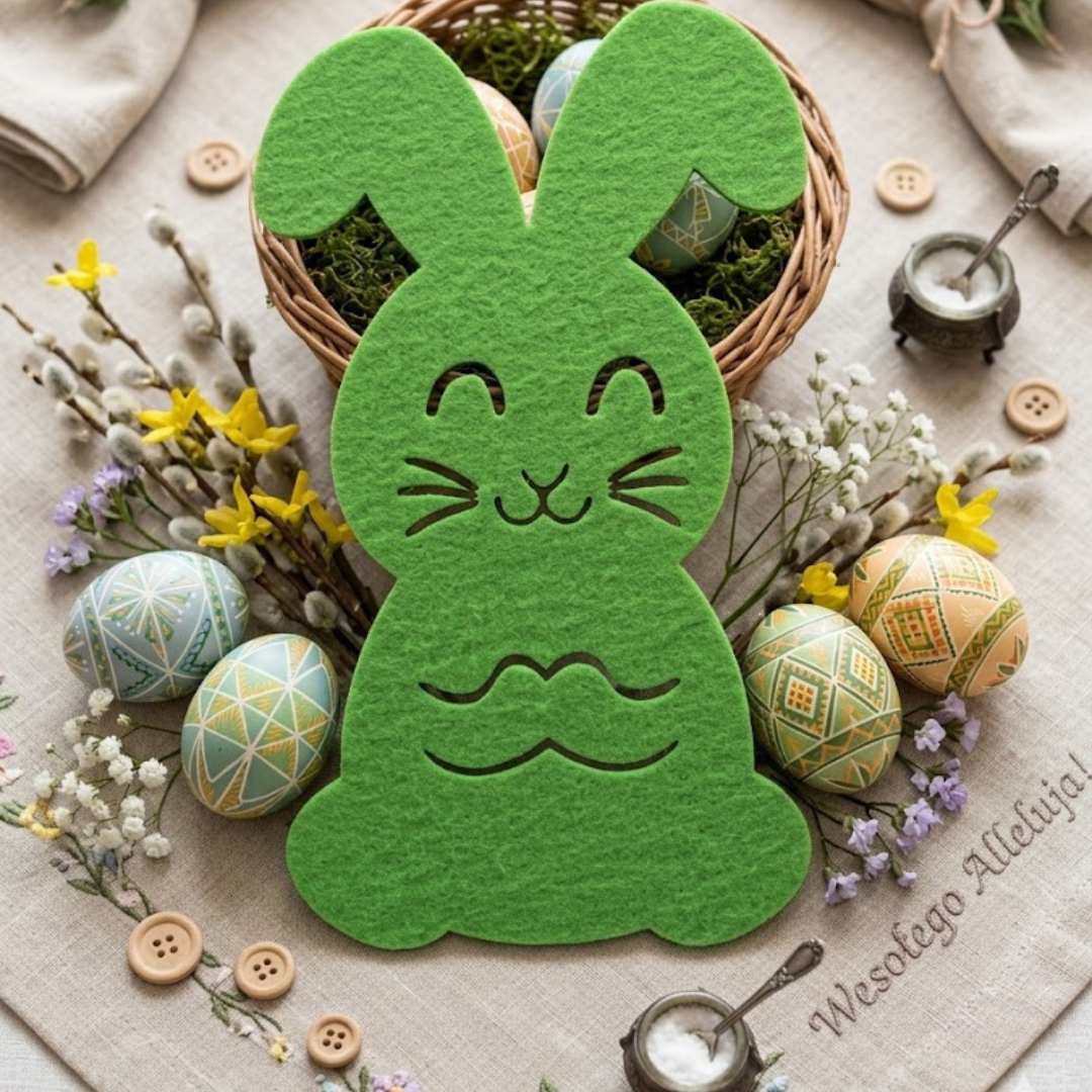Dekoracyjna podkładka pod sztućce w kształcie uroczego króliczka to idealny dodatek do wielkanocnego stołu. Wykonana z miękkiego filcu w świeżym, zielonym kolorze, pięknie podkreśla wiosenny charakter świątecznej aranżacji. Doskonale sprawdzi się jako praktyczna i estetyczna ozdoba podczas rodzinnego śniadania wielkanocnego.