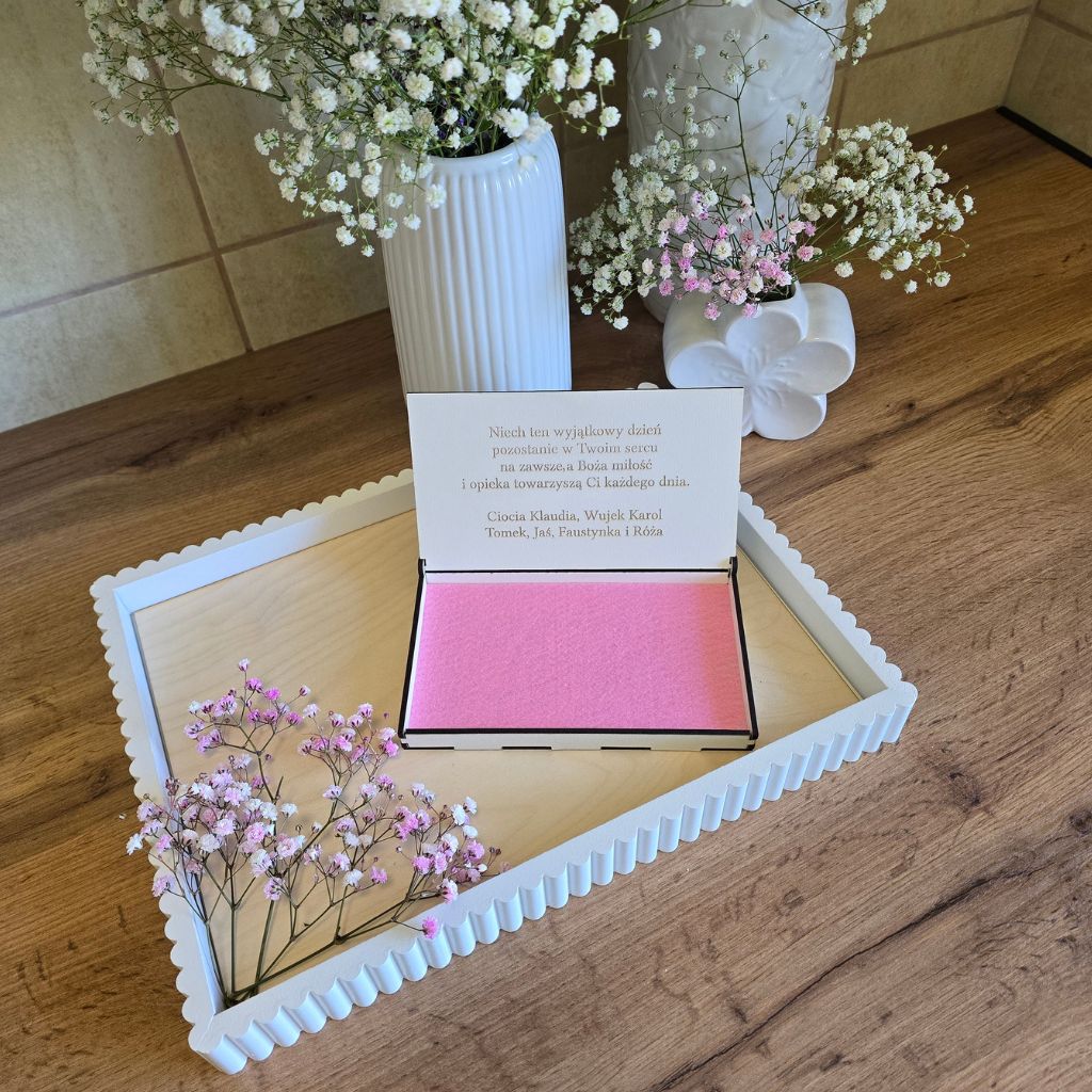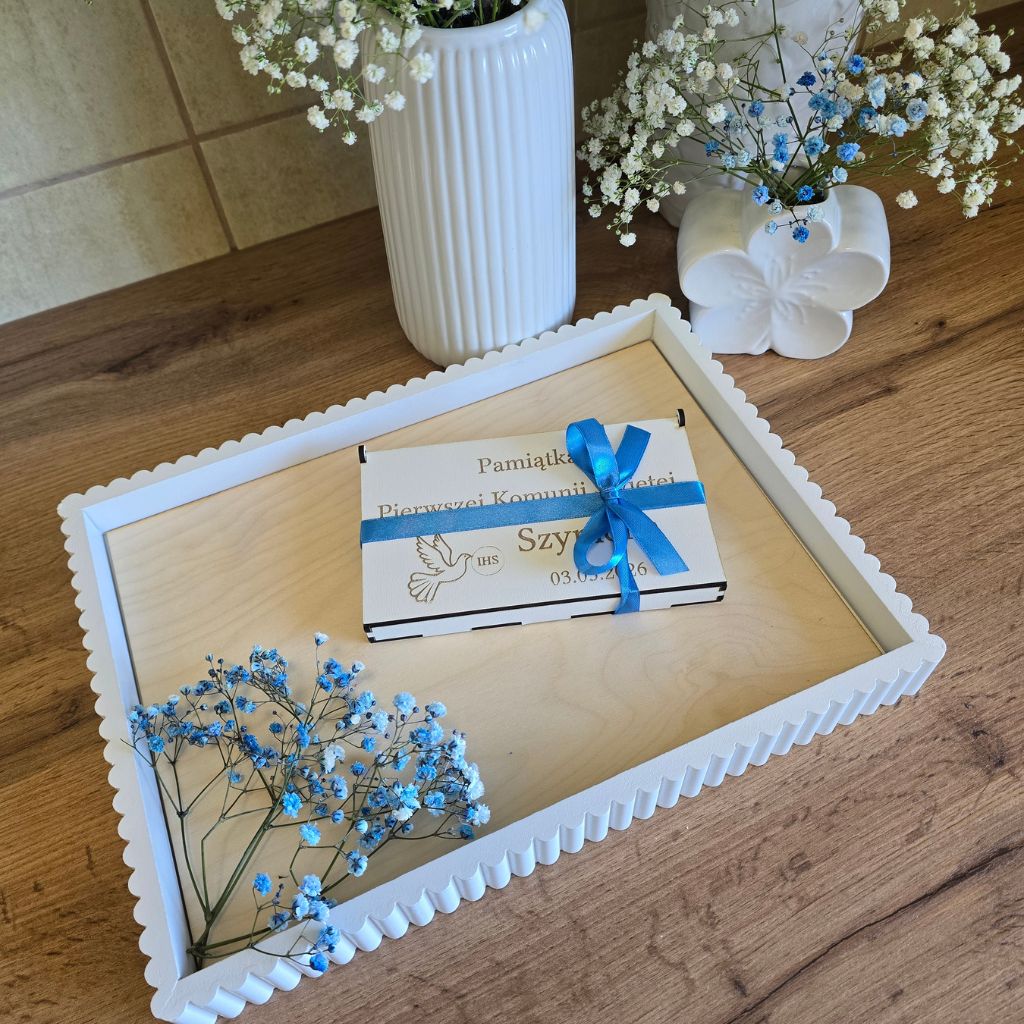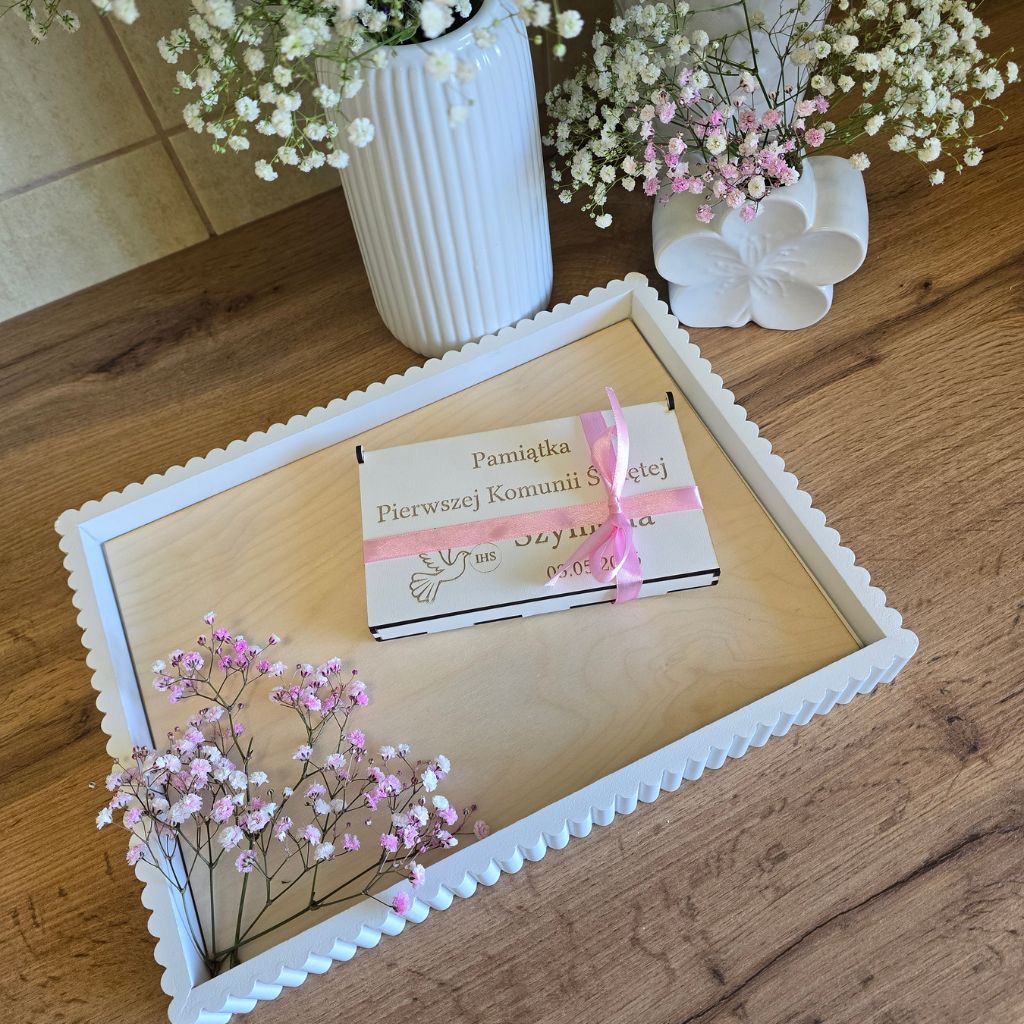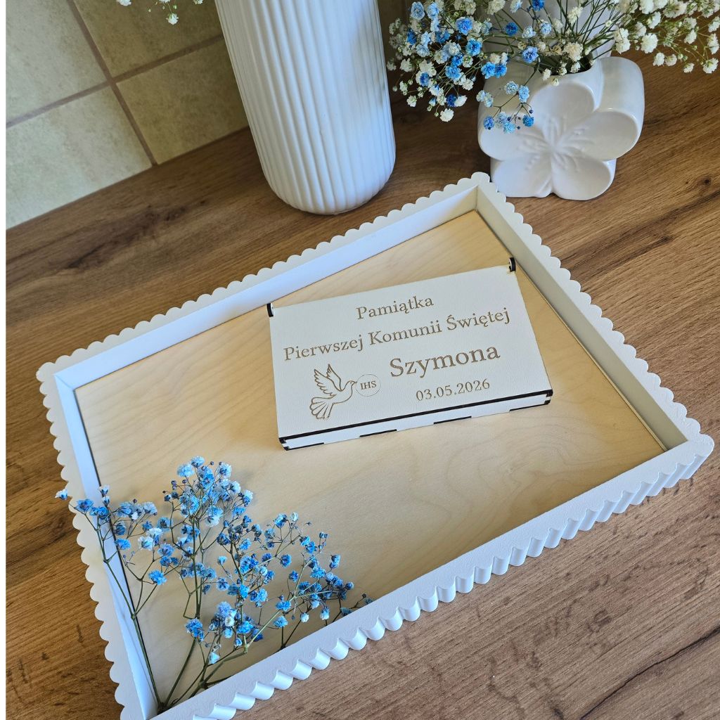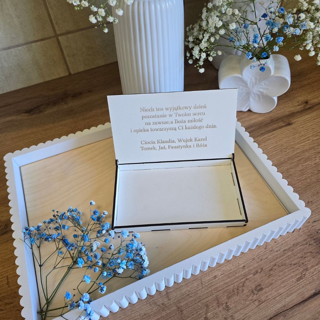 Eleganckie pudełko z płyty MDF podwójnej białej na prezent pieniężny z okazji Pierwszej Komunii Świętej. Starannie wykonane, z grawerem oraz możliwością personalizacji imieniem i datą uroczystości. Idealne jako wyjątkowa forma wręczenia pieniędzy oraz pamiątka na lata.
