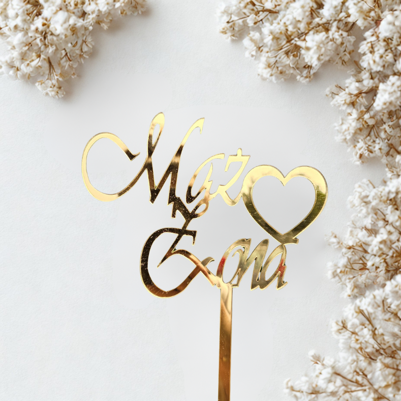 Symbol nowej drogi i pięknego „razem”. Złoty, lustrzany topper „Mąż & Żona II” to wyjątkowa dekoracja tortu, która podkreśli wagę tego najważniejszego dnia. Elegancki i ponadczasowy – będzie pięknym akcentem na weselnym stole, a także wyjątkową pamiątką na lata.
